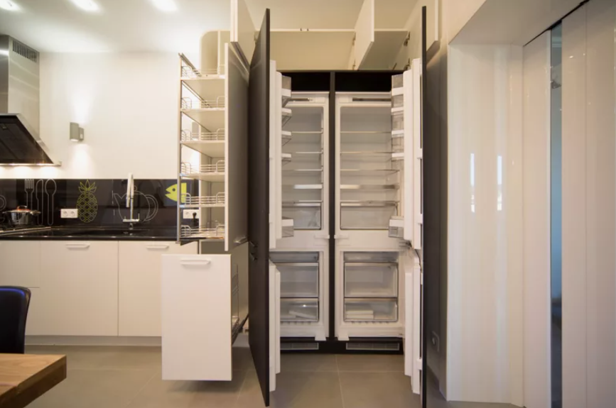 Встраиваемый холодильник — это часть кухонного гарнитура, у него отсутствует внешний корпус, и его стандартно устанавливают в заранее подготовленную нишу. Лицевая панель скрыта за дверцами мебели, создавая эффект единой композиции. Существуют варианты как полной, так и частичной встройки, где некоторые элементы остаются видимыми.
