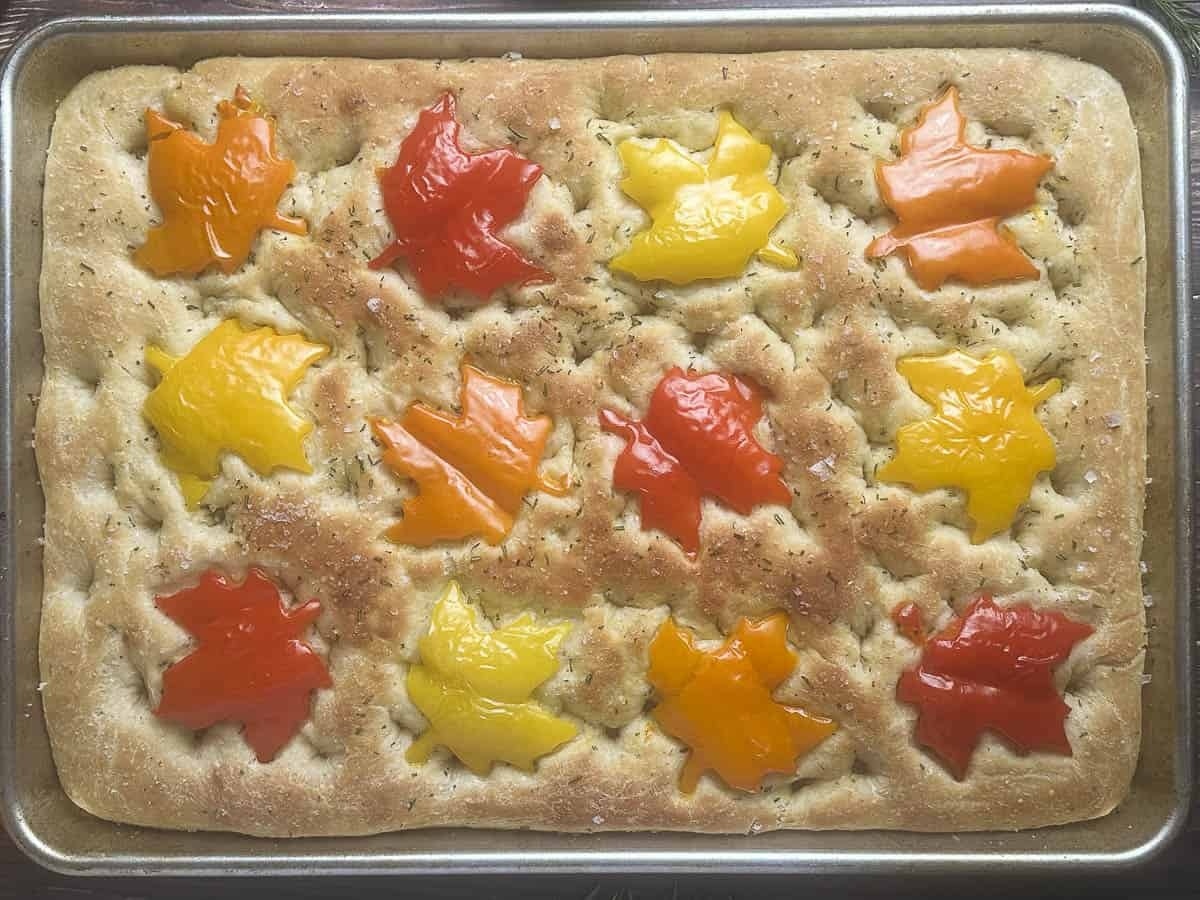 Простой, но эффектный способ украсить фокаччу — использование разноцветного болгарского перца, нарезанного в виде кленовых листьев. Такой декор идеально вписывается в осеннюю тематику и создает не только великолепный внешний вид, но и добавляет свежие сезонные нотки в каждый кусочек.