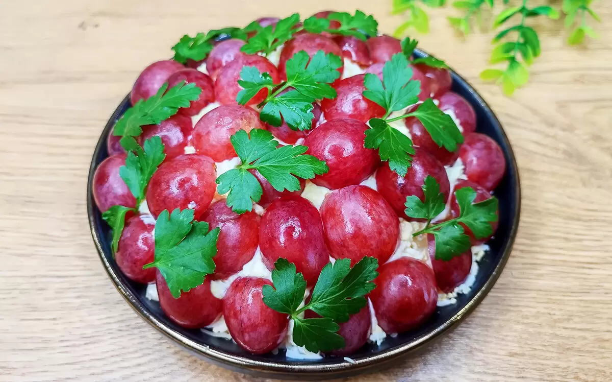 Салат «Тиффани» стал настоящей находкой для тех, кто ценит стильную подачу и оригинальные вкусы. Смелое сочетание винограда, орехов и сыра создает необычную гармонию, подходящую под любое праздничное настроение.