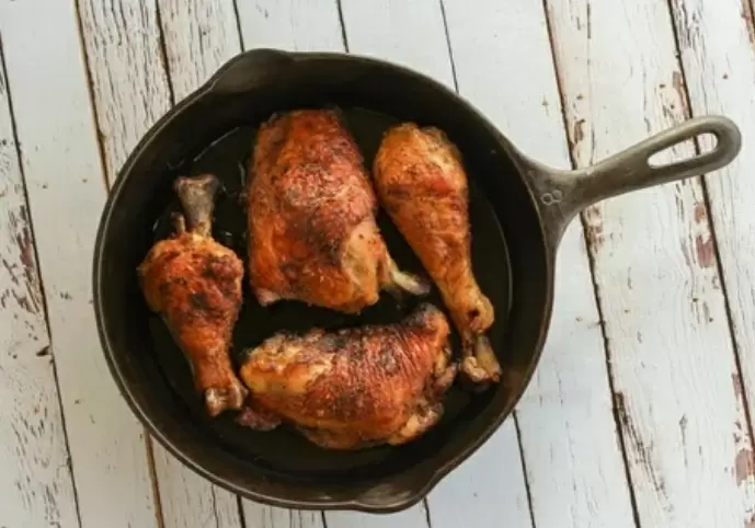 - Приготовление: Промыть курицу и обсушить. Натрите солью, перцем и паприкой, добавьте измельчённый чеснок. Разогрейте масло на среднем огне, выложите курицу кожей вниз и обжарьте до золотистой корочки (примерно 7–8 минут). Переверните и готовьте ещё 5–7 минут. Уменьшите огонь, накройте крышкой и тушите до готовности (10–15 минут). Подавайте горячей, украсив зеленью.