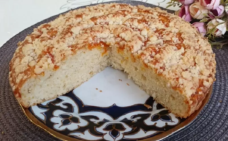 3. Подготовить форму диаметром 22 см, смазать растительным маслом и вылить в нее тесто. С помощью ложки равномерно распределить выбранный джем. После выпечки джем станет мягким и ароматным, добавляя неповторимый вкус пирогу. Сверху равномерно посыпать крошкой.