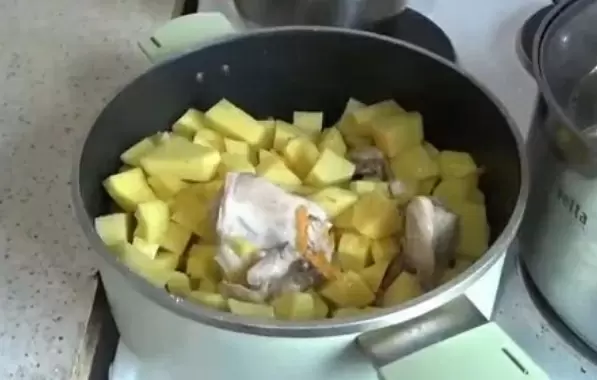 - Картофель нарезать и добавить в кастрюлю, залить водой так, чтобы она слегка покрывала содержимое, накрыть крышкой и тушить на медленном огне 40-60 минут.