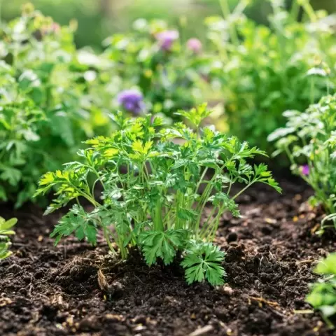Если вы ищете кудрявую петрушку с изысканными листьями, обратите внимание на сорт "Астра". С его нежными, гофрированными листьями становится не только красиво, но и практично. "Астра" быстро растет и эффектно восстанавливается после срезки, давая возможность собирать урожай несколько раз за сезон. Кроме того, этот сорт отлично переносит изменения погоды и проявляет неплохую устойчивость к недостатку солнечного света, что делает его ценным пополнением вашей коллекции зелени.