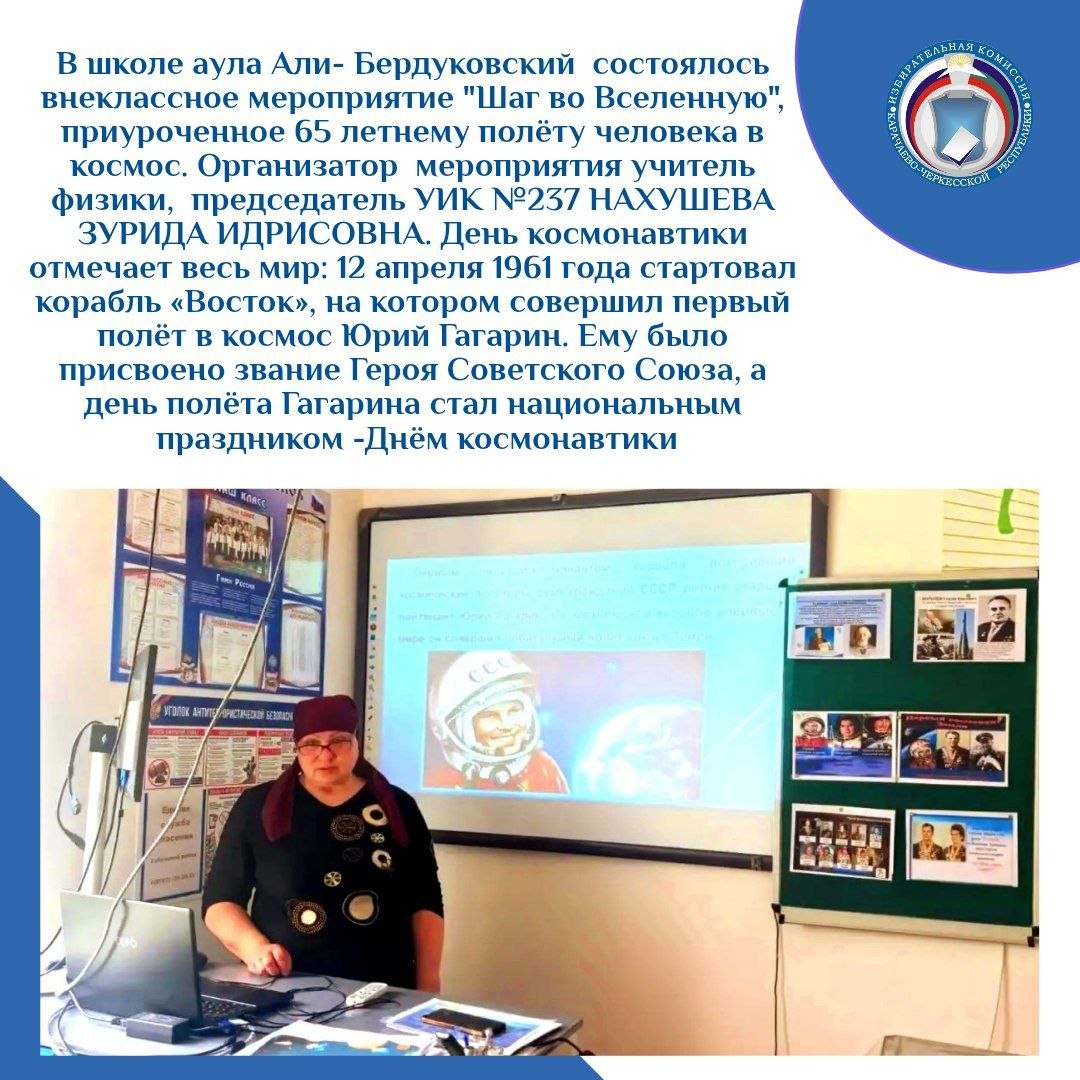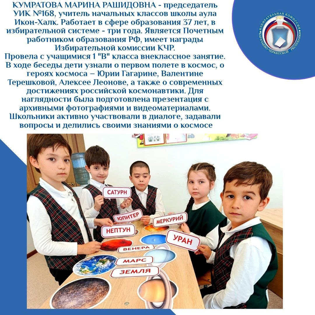 Покорение космоса – одна из тех страниц истории нашей страны, которыми мы безоговорочно можем гордиться! Об этом, традиционно, в школах Карачаево-Черкесии рассказали подрастающему поколению. Мероприятия провели наши коллеги - работники участковых избирательных комиссий республики - учителя.
