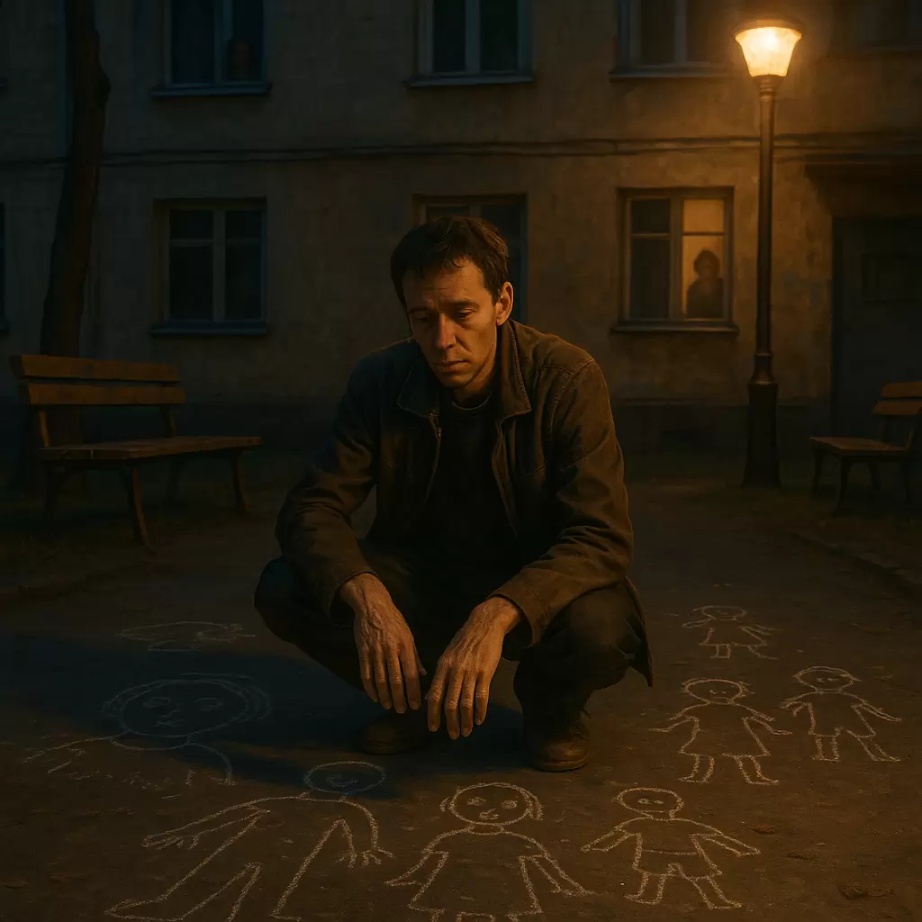 Однажды, во время вечернего наблюдения, они увидели мужчину, в легкой куртке у которого в руках был мел. Высокий, сутулый, он не медля начал выводить линии на асфальте — как будто рассказывая свою историю. «Это же Костя из второго подъезда. Неужели он сошёл с ума?» — шептались женщины.