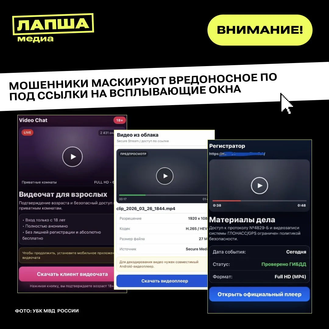 Подобные ссылки якобы содержат «полезную информацию». Например, предлагается посмотреть видео ДТП с участием пользователя, воспользоваться базой данных пропавших близких или скачать видеоплеер. Однако взаимодействие с такими окнами может повлечь за собой заражение устройства.