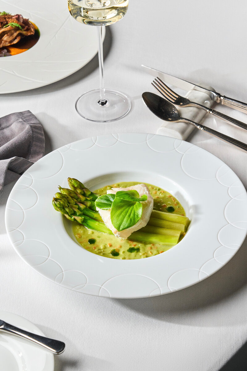 Клыкач — рыба, ценящаяся за свое нежное мясо, богатое белками, полезными жирами и витаминами. Для гарнира выбрана свежая зеленая спаржа, которая не только прекрасно сочетается с рыбным вкусом, но и добавляет блюду яркую цветовую палитру и текстуру.