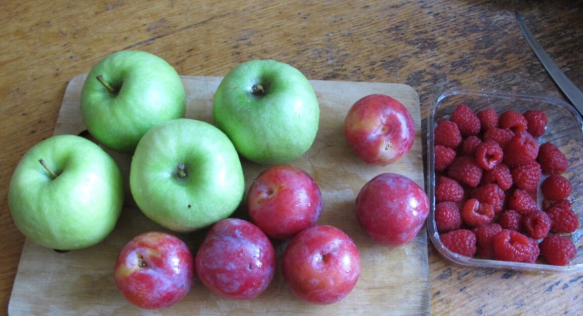 Для начала каждое яблоко нарезается на восемь долек, удаляя семена и семенные камеры. Сливы следует разделить на четыре части, чтобы удалить косточку. Малина обычно предлагается в упаковке по 125 граммов. Сахар можно использовать в количестве около 200 граммов, добавив пакетик ванильного сахара для аромата.