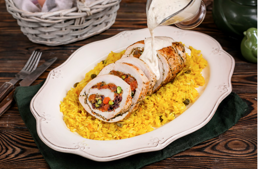 Приготовить соус из сливок и сушеных грибов, подсолив и поперчив по вкусу, до загущения. Каперсы разрезать пополам и добавить в готовый рис. Подавайте рулет из индейки с ароматным рисом и нежным сливочным соусом.