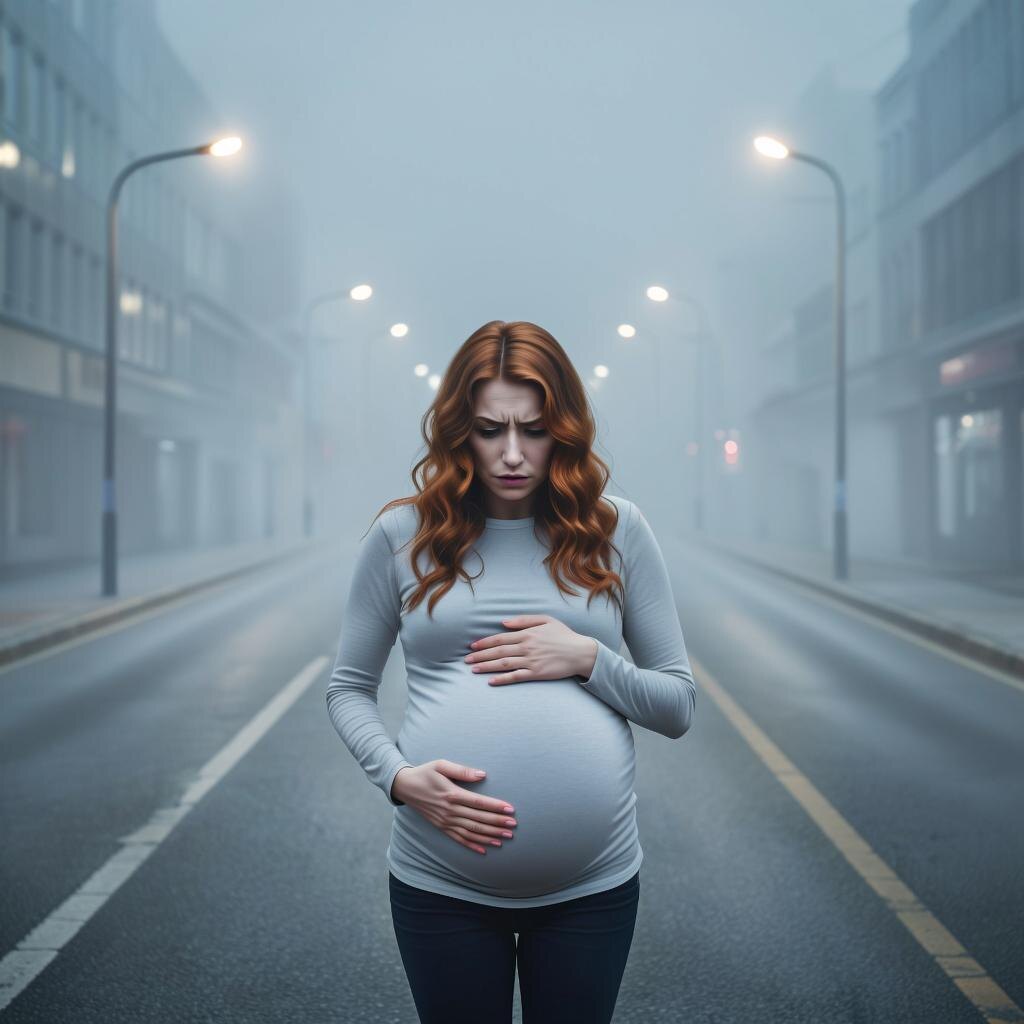 В центре загадочного и мрачного города разыгрывается драма, где смятение и надежда ведут свою борьбу. На пустынной улице, окутанной туманом, стоит женщина с заметно увеличившимся животом, зарождающимся с каждым моментом ощущением материнства и тревоги. Чувство одиночества и безысходности окутывает её, как дым, мешая различить направление в темной бездне.