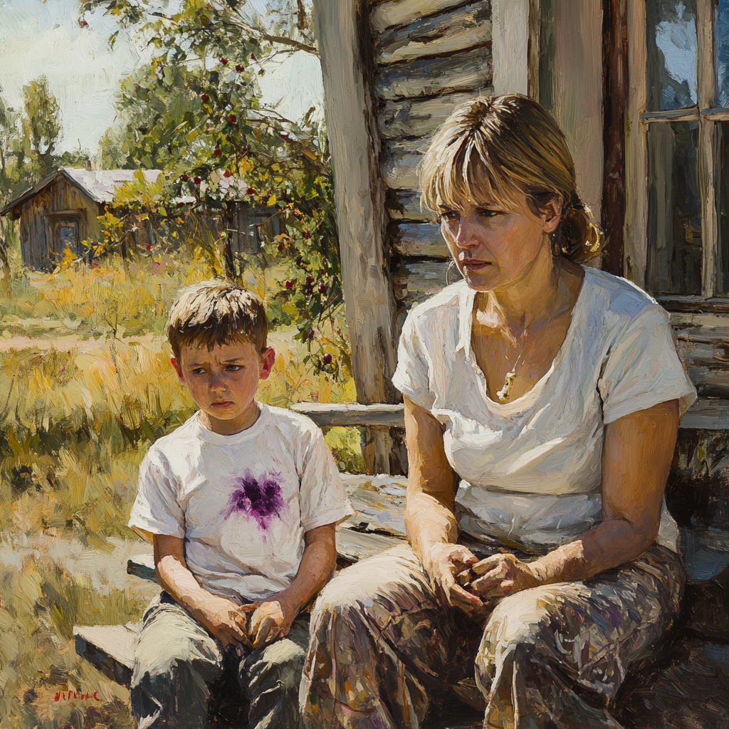 На уютной кухне дачного домика Полина безнадежно смотрит на футболку сына, на которой красуется яркое фиолетовое пятно от смородины. Оно выглядит как символ войны между детьми и ягодами.